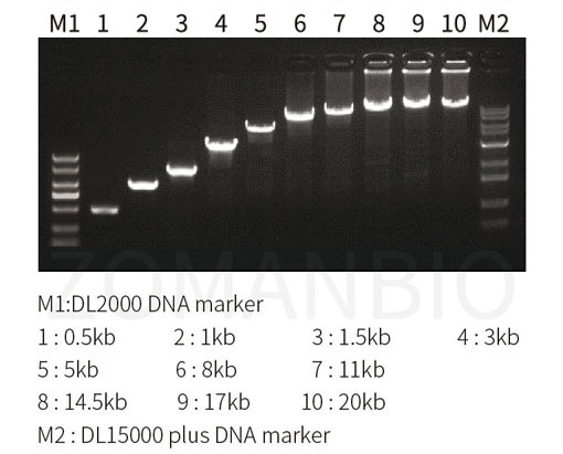 (1)玉米基因組DNA模板,分別擴增0.5kb、1kb、1.5kb、3kb、5kb、8kb、11kb、14.5kb、17kb、20kb片段