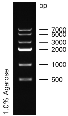 本產品是由6條線性雙鏈DNA條帶組成,適用于瓊脂糖凝膠電泳中DNA條帶的分析。產品中已含有1×loading buffer,可根據實驗需要,直接取2-5μl電泳,使用方便,電泳圖像清晰。6條帶的大小分別為500,1000,2000,3000,5000,7000bp。其中2000bp條帶約為100ng/5μl,顯示加亮帶,其余條帶濃度約為50ng/5μl。