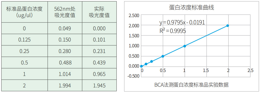 BCA(bicinchoninic acid)法蛋白濃度定量試劑盒是一種抗干擾能力強且準確定量的蛋白含量檢測試劑盒。眾所周知,二價銅離子在堿性的條件下,可以被蛋白質還原成一價銅離子(biuret reaction),一價銅離子和獨特的 BCA Solution A(含有 BCA)相互作用產生敏感的顏色反應。兩分子的 BCA 螯合一個銅離子,形成紫色的反應復合物。該水溶性的復合物在 562nm 處顯示強烈的吸光性,吸光度和蛋白濃度在廣泛范圍內有良好的線性關系,因此根據吸光值可以推算出蛋白濃度。