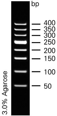本產品是由8條線性雙鏈DNA條帶組成,適用于瓊脂糖凝膠電泳中DNA條帶的分析。本產品為即用型產品,已含有1×loading buffer,可根據實驗需要,直接取2-5μl電泳,使用方便,電泳圖像清晰。本產品中8條帶分為50,100,150,200,250,300,350,400bp,其中250bp條帶約為100ng/5μl,顯示加亮帶,其余條帶濃度約為50ng/5μl。