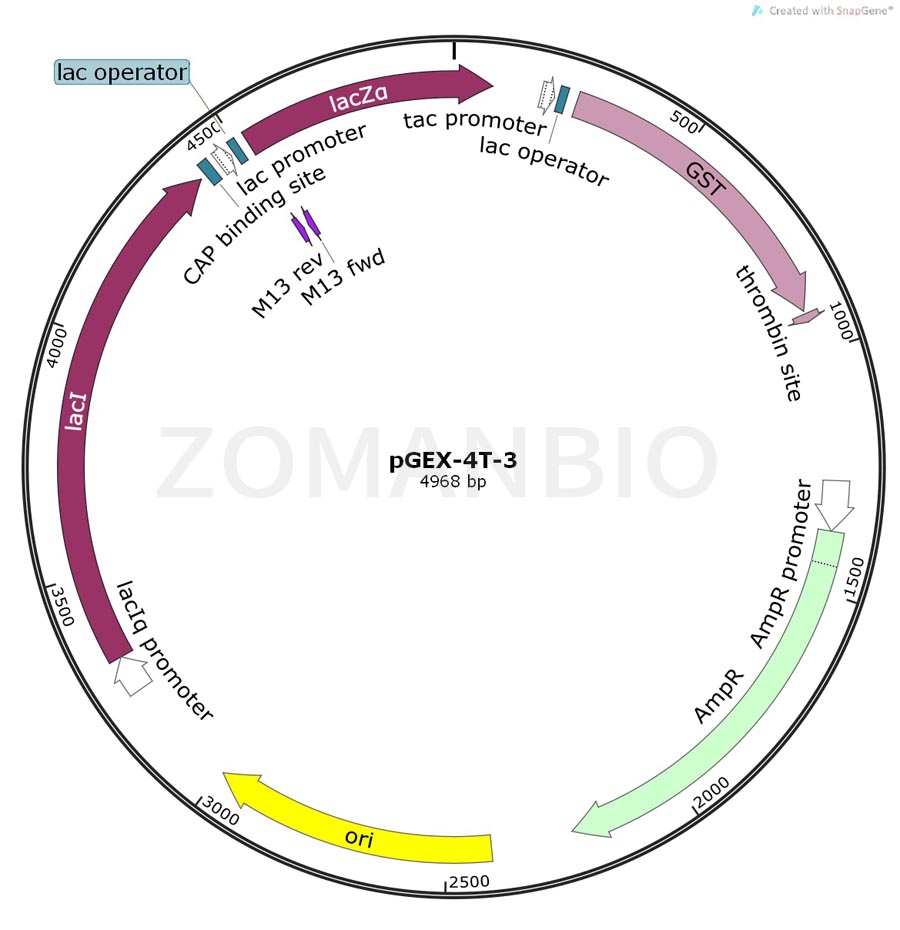 pGEX-4T-3是一個大腸桿菌表達載體質粒,可通過MCS處的酶切位點連入目的基因,Tac啟動子啟動GST促溶標簽和目的基因融合表達。質粒只保證關鍵序列正確,不保證表達效果。