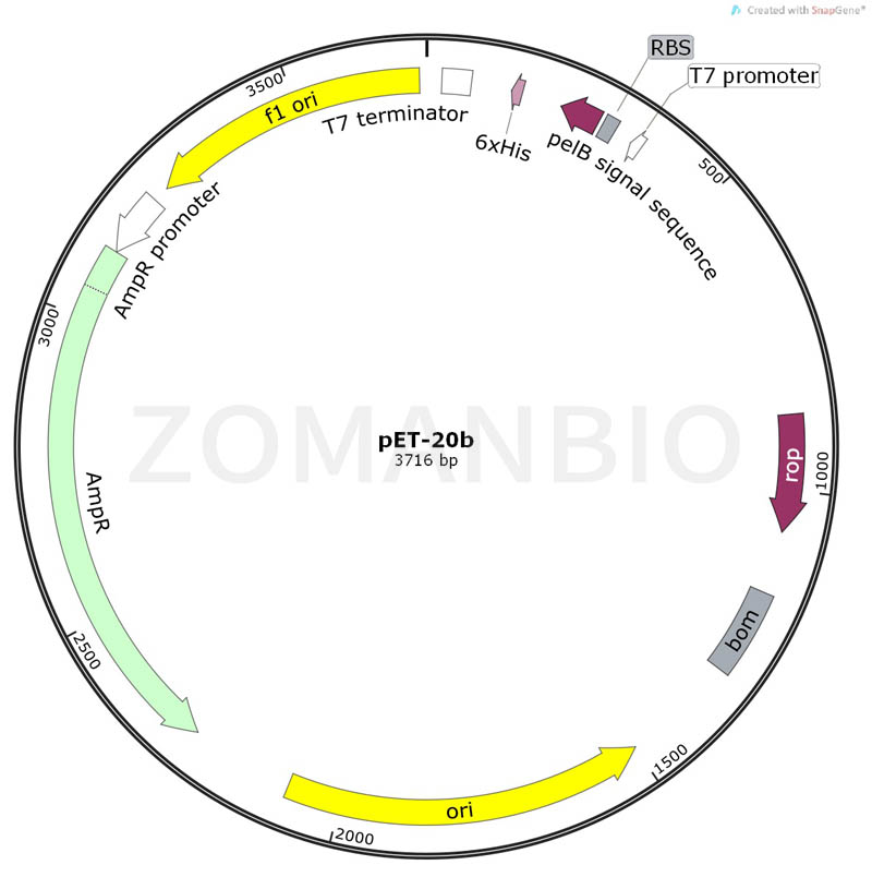 pET-20b質粒是一個大腸桿菌蛋白表達載體,T7啟動子驅動目的基因和6×HIS標簽融合表達,并在pelB信號肽的作用下分泌至細胞周質。The pET-20b vector carries an N-terminal pelB signal sequence for potential periplasmic localization, plus optional C-terminal His?Tag? sequence. Unique sites are shown on the circle map. Note that the sequence is numbered by the pBR322 convention, so the T7 expression region is reversed on the circular map. The cloning/expression region of the coding strand transcribed by T7 RNA polymerase is shown below. The f1 origin is oriented so that infection with helper phage will produce virions containing single-stranded DNA that corresponds to the coding strand. Therefore, single-stranded sequencing should be performed using the T7 terminator primer.質粒只保證關鍵序列正確,不保證表達效果。