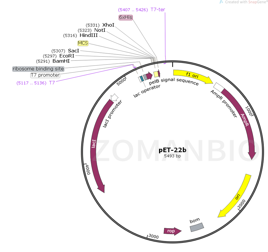 pET-22b質粒是一種原核表達載體,N端含有一個pelB前導肽、C-端的His標簽。該質粒含有多個常用的酶切位點,便于不同基因克隆。表達由宿主細胞提供的T7 RNA聚合酶誘導,目的基因被克隆到質粒載體上,受噬菌體強轉錄及翻譯信號控制。T7 RNA聚合酶啟動的克隆和表達區域在質粒圖譜中也被標注了出來。質粒的F1復制子是被定向的,所以在T7噬菌體聚合酶的作用下,包含有蛋白編碼序列的病毒 粒子能夠產生,并啟動蛋白表達,同時蛋白表達將被T7終止子序列的作用下終止蛋白翻譯。
