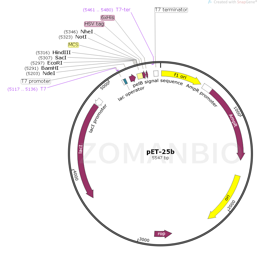 pET-25b質粒是一種原核表達載體,C端含有一個6×His標簽、HSV標簽,N端含有一個pelB前導肽。該質粒含有多個常用的酶切位點,便于不同基因克隆。表達由宿主細胞提供的T7 RNA聚合酶誘導,目的基因被克隆到質粒載體上,受噬菌體強轉錄及翻譯信號控制。pET25b載體的單一的多克隆位點見上面的環狀質粒圖譜。注意:載體序列是以pBR322質粒的編碼規矩進行編碼的,所以T7蛋白表達區在質粒圖譜上面是反向的。T7 RNA聚合酶啟動的克隆和表達區域在質粒圖譜中也被標注了出來。質粒的F1復制子是被定向的,所以在T7噬菌體聚合酶的作用下,包含有蛋白編碼序列的病毒 粒子能夠產生,并啟動蛋白表達,同時蛋白表達將被T7終止子序列的作用下終止蛋白翻譯。