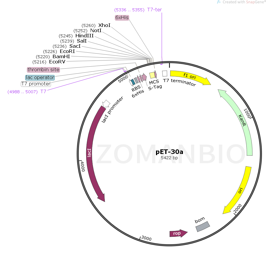 pET-30a質粒是一種原核表達載體,C端含有一個6×His affinity標簽,N端含有一個thrombin位點、6×His affinity標簽、EK標簽和S標簽。該質粒含有多個常用的酶切位點,便于不同基因克隆。表達由宿主細胞提供的T7 RNA聚合酶誘導,目的基因被克隆到質粒載體上,受噬菌體強轉錄及翻譯信號控制。