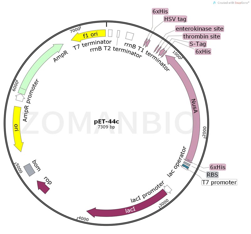 The pET-44 vectors are designed for cloning and high-level expression of peptide sequences fused with the 495 aa Nus?Tag? protein. Compared to the pET-43.1 series, the pET-44 vectors encode an additional N-terminal His?Tag. Unique sites are shown on the circle map. Note that the sequence is numbered by the pBR322 convention, so the T7 expression region is reversed on the circle map. The cloning/expression region of the coding strand transcribed by T7 RNA polymerase is shown below. The f1 origin is oriented so that infection with helper phage will produce virions containing single stranded DNA that corresponds to the coding strand. Therefore, single stranded sequencing should be performed using the COLIDOWN primer . Vector encoded sequence can be completely removed when cloning into the PshA I or Sma I sites (as shown below) by cleaving the Nus?Tag fusion protein with enterokinase or thrombin, respectively. 質(zhì)粒只保證關(guān)鍵序列正確,不保證表達效果。