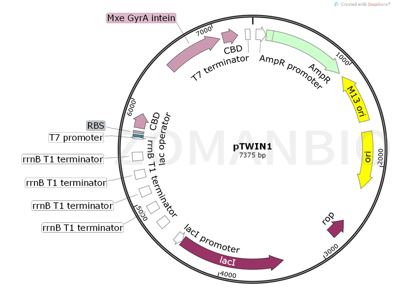 pTWIN1 is an E. coli plasmid cloning vector designed for recombinant protein expression, labeling, and cyclization using the IMPACT-TWIN Kit (1). It contains the pMB1 origin of replication from pBR322 and is maintained at a similar copy number to pBR322; in addition, pTWIN1 also contains an M13 origin of replication.