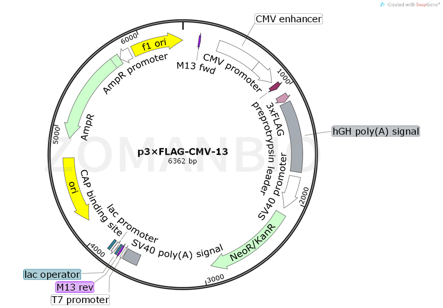 The p3XFLAG-CMV-13 Expression Vector is a 6.3kb derivative of pCMV5 used to establish expression of transient or unstable C-terminal 3XFLAG fusion proteins in mammalian cells. The vector encodes three adjacent FLAG epitopes (Asp-Tyr-Lys-Xaa-Xaa-Asp) downstream of the multiple cloning region. This results in increased detection sensitivity using ANTI-FLAG M2 antibody. The promoter-regulatory region of the human cytomegalovirus drives transcription of FLAG-fusion constructs. The preprotrypsin leader sequence precedes the FLAG sequence. The aminoglycoside phosphotransferase II gene (Neo) confers resistance to aminoglycosides such as G 418, allowing for selection of stable transfectants. p3XFLAG-CMV-13 Expression Vector is a shuttle vector for E. coli and mammalian cells. Efficiency of replication and genomic integration is optimal when using an SV40 T antigen-expressing host, such as COS cells.