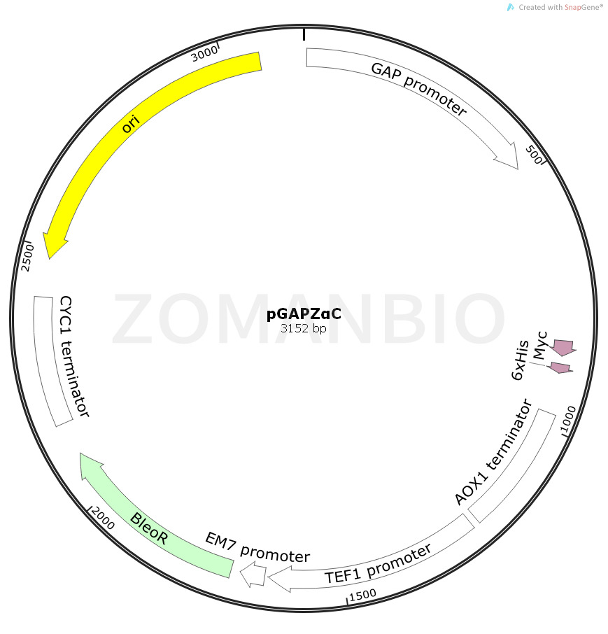 pGAPZ A,B,和C載體(2.9 KB)和pGAPZαB和C(3.1 KB)載體使用GAP啟動子在畢赤酵母中穩定表達重組蛋白。重組蛋白表達為為帶有C-末端myc抗原表位和C端His標簽的融合蛋白。此外,pGAPZα 表達的融合蛋白在N-端帶有釀酒酵母(Saccharomyces cerevisiae)的α-因子分泌信號肽。這兩個系列的載體都提供三個不同讀碼框的載體,以方便克隆的帶有C-端標簽和/或N-末端分泌信號肽的載體中。
