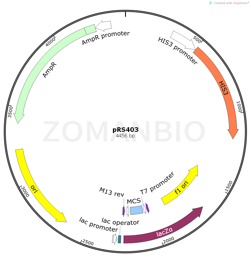 pRS4xx系列質粒被用于基因的穿梭載體克隆釀酒酵母,但能夠在大腸桿菌中復制。雖然在大腸桿菌中,他們從pMB1的復制原點復制至pBR322。他們攜帶的bla(APR)標記用于選擇用氨芐青霉素和復制的噬菌體F1原點單鏈DNA 。pRS403 through pRS406 are integrative plasmids (YIp); pRS413through pRS416 (shown below) are centromeric plasmids (YCp),and differ from the YIp by the insertion of a centromere (CEN)and autonomously replicating sequence (ARS); pRS423 throughpRS426 are episomal plasmids (YEp), and carry instead theorigin of replication from the yeast 2μ circle plasmid along withREP3 and FRT sequences (2). The 4 vectors in each series differonly in the yeast auxotrophic marker used: HIS3 (pRS4x3), TRP1(pRS4x4), LEU2 (pRS4x5) or URA3 (pRS4x6).