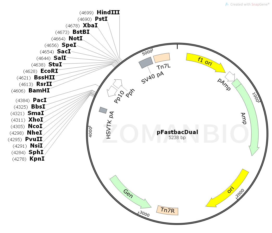 pFastBac Dual昆蟲細胞表達載體包含有兩個啟動子,能夠同時表達兩個外源基因,一個表達基因是polyhedrin (PH)啟動子控制,另一個外源基因是由p10啟動子控制。